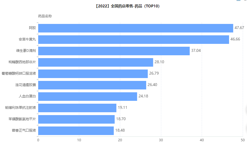 2022年,全国药店零售市场最畅销TOP10药品分别是:阿胶、安宫牛黄丸、维生素D滴剂、枸橼酸西地那非片、葡萄糖酸钙锌口服溶液、连花清瘟胶囊、人血白蛋白、帕博利珠单抗注射液、苯磺酸氨氯地平片、藿香正气口服液。