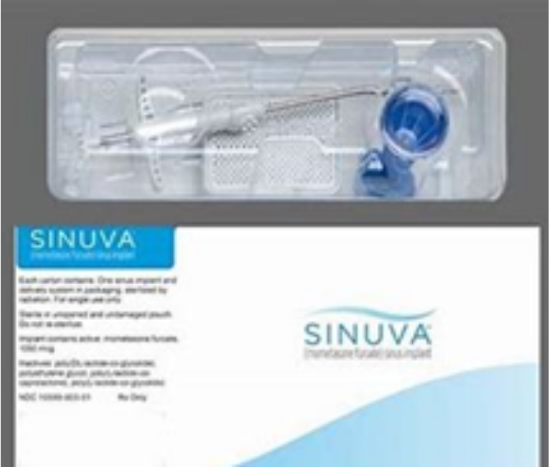 1 SINUVA鼻窦种植体是一种皮质类固醇洗脱(糠酸莫米松)种植体,聚(l -乳酸-co-e-己内酯)包被糠酸莫米松,嵌入含有聚(dl -乳酸-羟基乙酸酯)和聚乙二醇(非活性成分)的生物可吸收聚合物基质中,用于治疗18岁筛窦手术患者的鼻息肉。SINUVA鼻窦植入物被装入输送系统,并在内镜下放置于筛窦内,在90天内逐渐释放皮质类固醇。