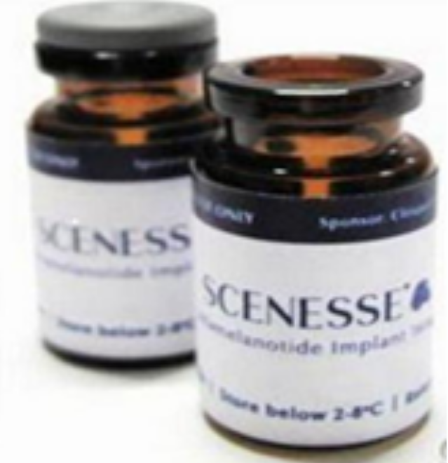 2 Scenesse是全球首个获批准用于治疗EPP患者的提供系统性光保护作用以预防光毒性的药物。辅料为聚(DL-丙交酯-共乙交酯),它通过刺激皮肤中黑色素生成、提高皮肤中黑色素水平,而提供光保护作用,可作为一种光保护剂屏蔽光照和紫外线辐射(UVR)对皮肤的影响。使用方法为每2个月1次,植入皮下后可在2天内观察到皮肤色素沉着,药效长达2个月。