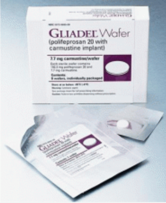 2 GLIADEL®WAFER为一种白色至灰白色的一角硬币大小的薄膜,包含生物可降解聚合物聚苯丙生20和7.7mg卡莫司汀(carmustine,BCNU),卡莫司汀是治疗恶性胶质瘤的常用静脉给药的化疗药物。当手术切除脑瘤时,在经手术创建的空腔中可最多植入8片本品。在植入处,Gliadel将缓慢溶解,直接向肿瘤部位释放高浓度卡莫司汀,使扩撒到其它部位的药物减至最少。Gliadel适应证是新诊断为高度恶性胶质瘤的患者的手术和放疗辅助药物,也可作为多形性胶质母细胞瘤(GBM)复发患者的手术辅助用药。