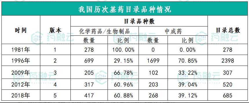 2000年以来,共有2009年、2012年和2018年三版国家基药目录,目前在用的是2018年版,品种增加到了685个药品,包括417种化学生物制品,268种中成药。