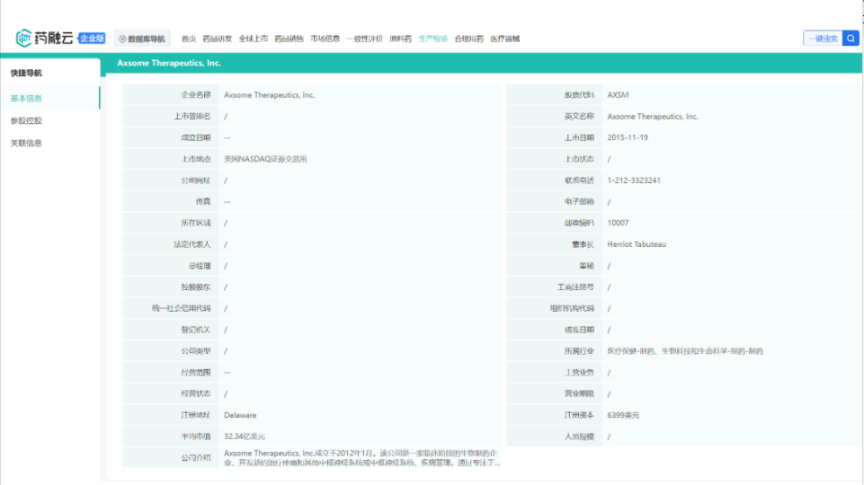 据悉,Axsome Therapeutics成立于2012年1月,重点开发针对阿尔兹海默症、抑郁症等神经领域疾病药物。通过专注于这一治疗领域,他们正在解决显著和不断增长的市场,其中目前的治疗选择是有限或不充分的,Axsome Therapeutics的目标是成为一个完全集成的生物制药公司,通过开发和商业化的拓展提供给医护人员治疗方案,提高生活疼痛和其他中枢神经系统(CNS)疾病患者的生命分化疗法。