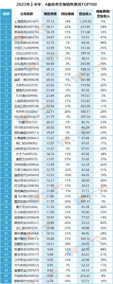 根据申万行业分类,A股上市医药生物类板块(药械,样本为487家公司)财报,我们统计了2023H1各个公司销售费用支出TOP100情况: