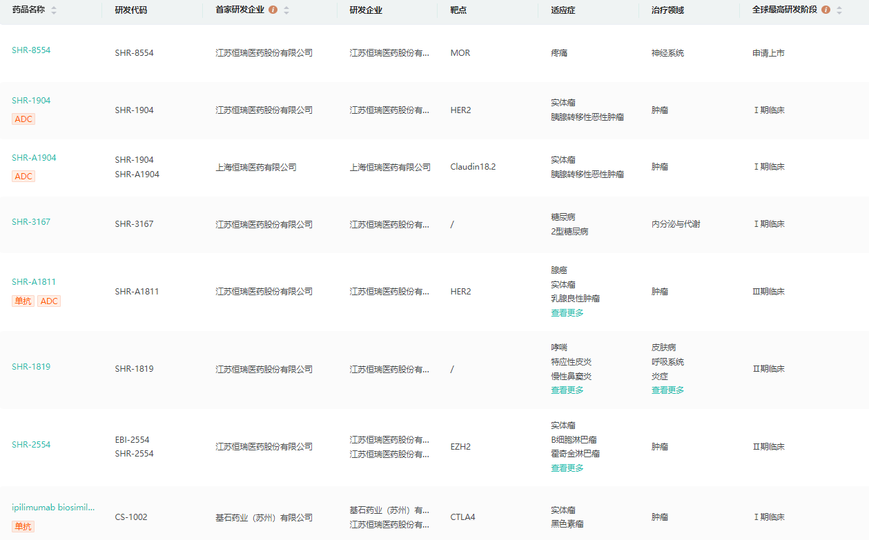 恒瑞医药研发管线(部分)