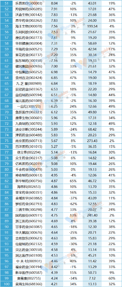5、港股上市的华润医药(03320),上半年销售费用支出97亿元人民币左右,同比增长15%,占主营比例7.51%。中国生物制药上半年销售费用支出53.82亿元,同比增长-6.42%,占总营收比例分别为35.23%。石药集团上半年销售费用支出49亿元,同比降低9%,占总营收比例为30.49%。信达生物上半年销售费用支出13.47亿元,同比降低4%,占总营收比例为50%。