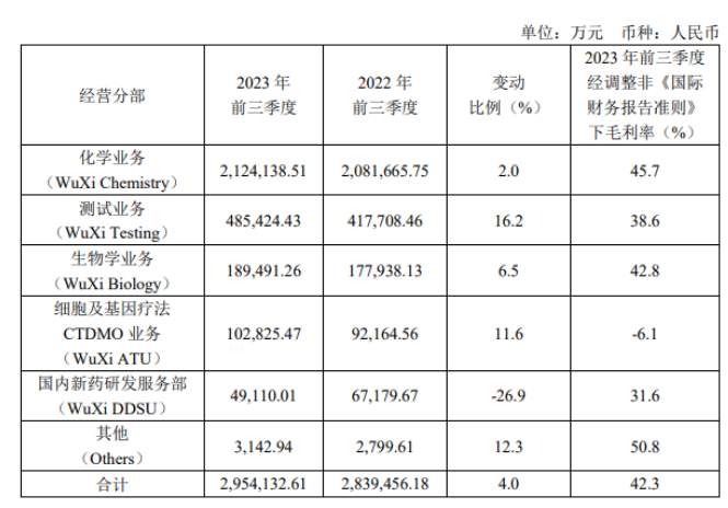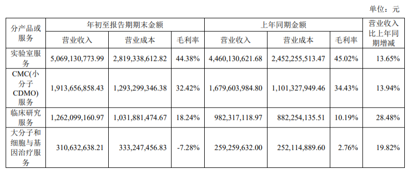 康龙化成2023前三季度营收85.6亿元,同比增长16%;净利润11.39亿元,同比增长18.51%。其中大分子和细胞与基因治疗服务营收3.11亿元,同比增长20%,占收入3.63%。