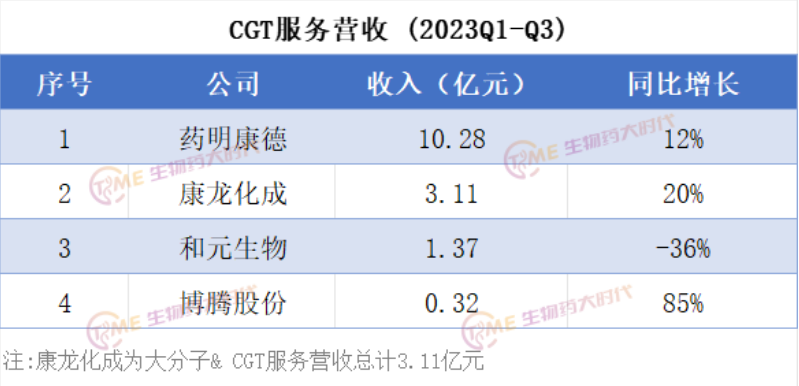 放眼国内,CGT CDMO代表企业有:药明康德、和元生物、康龙化成、博腾生物和金斯瑞生物。随着三季报的披露(金斯瑞生物还未披露,未纳入表格),我们汇总了这些公司2023年前三季度涉及CGT 服务的收入情况,如下所示: