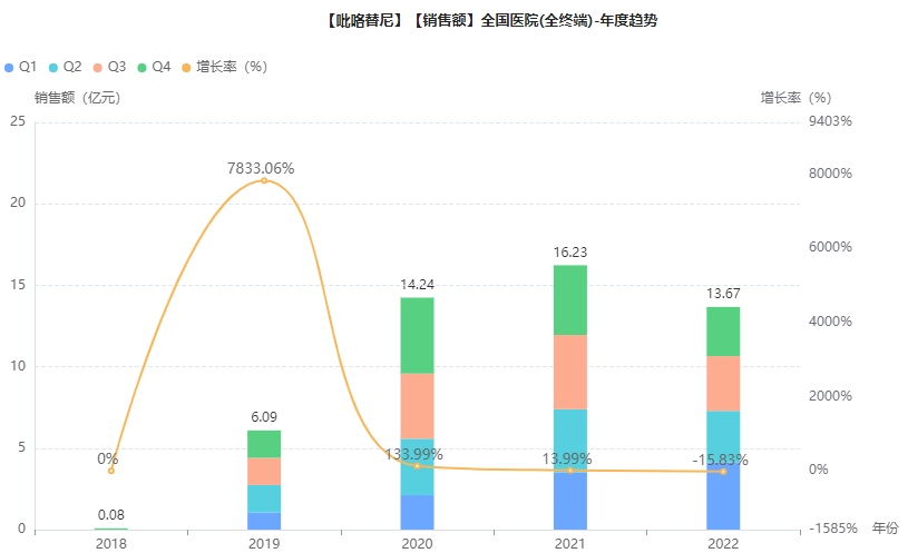 吡咯替尼医院端市场的年度销售趋势