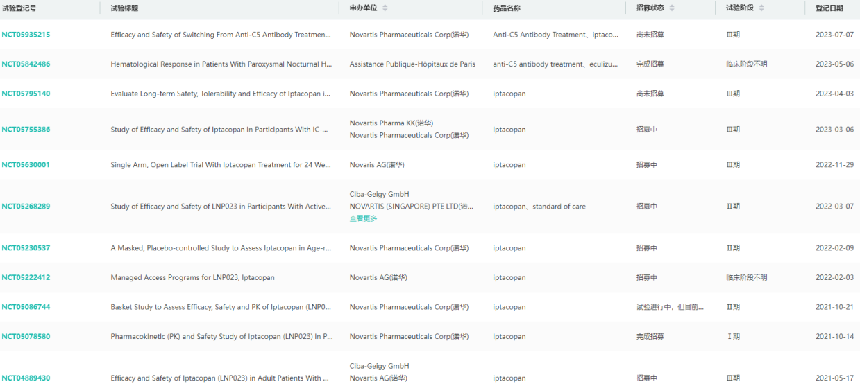 iptacopan全球临床试验查询