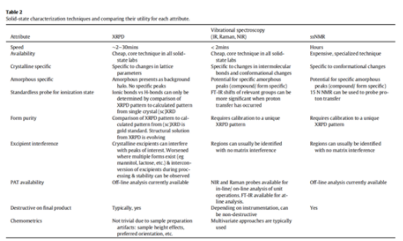 因此,无法直接比较或假设这些技术的灵敏度,还是需要根据各个品种的自身特点去做详细的分析检测已开发出专属性、灵敏度适宜的检测方法。如下表为文献中介绍的几种固态表征技术开发时需要考虑的方法的专属性,以及对每个属性效用的介绍。