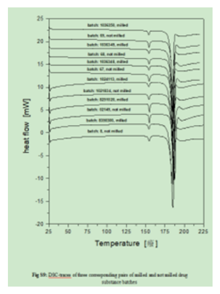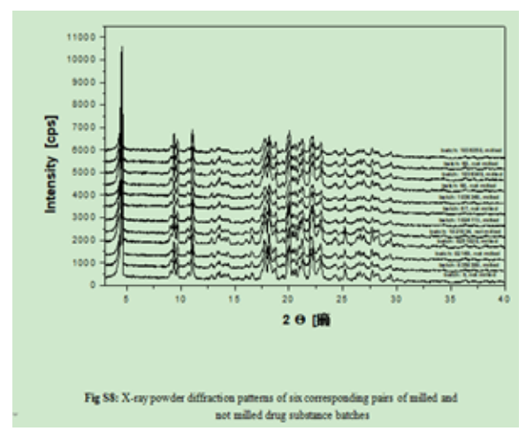 主要通过X射线粉末衍射、热分析和溶液量热(溶液热)等手段,对不同批次的研磨和未研磨原料药批次进行分析,以观察研磨过程是否引起固态相变(部分或全部转变为无水型II或非晶态)。结果显示所有方法(原则上能够检测固态相变)都没有检测到研磨和未研磨之间的任何差异,因此可以得出结论,没有发生向无水型II (LOQ: 0.6%)或非晶态的转变。
