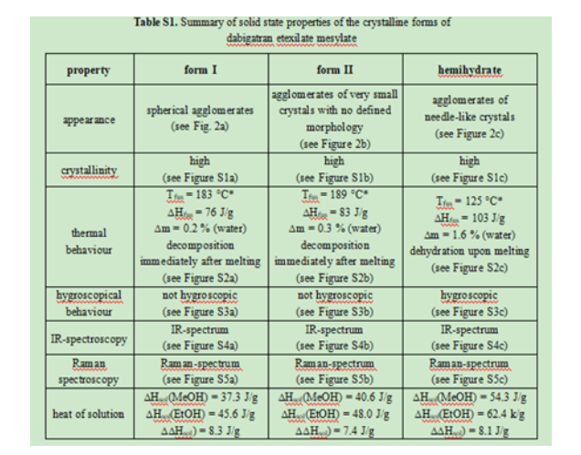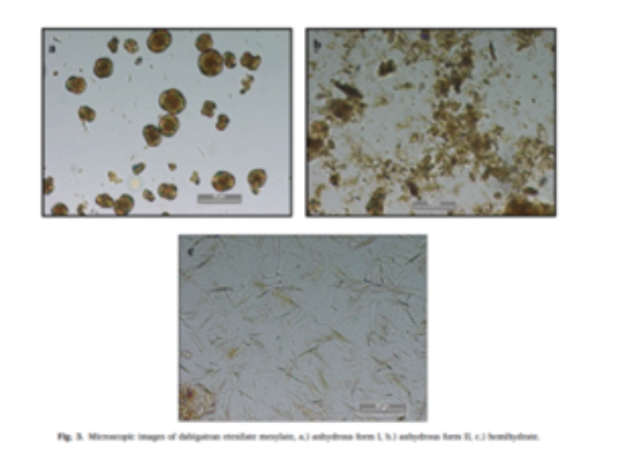 半水化合物在热力学上也是一种稳定的形态,但由于晶体形态不利,没有被选中进行开发。半水结晶成很长很细的针状物(见图2c),导致比无水形式II更差的物理化学性质。此外,达比加群酯甲磺酸盐对水解的敏感性阻止了其水合形式的发展。因此,半水合物虽然热力学稳定,但不能被选做目标晶型。