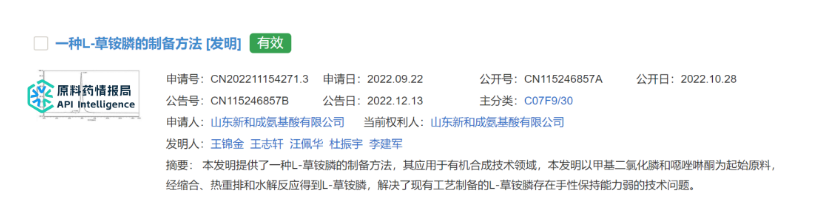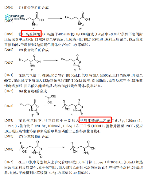 根据利尔化学一种制备L-草铵膦的方法的相关专利。本发明以廉价易得的L-高丝氨酸为起始原料,通过三步反应制备得到了高ee值的L-草铵膦,无需手性催化,成本低廉,具有潜在的工业化应用价值。
