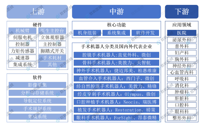 手术机器人产业链上游为硬件、软件供应商,硬件包含伺服电机、控制器、传感器、减速器、集成系统、主控台等,软件主要包括影像采集、分析与存储、导航定位、手术规划、集成系统。
