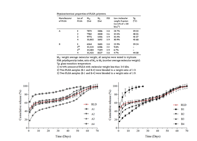 一般来说,大量药品从微球中不受控制的爆发释放可能导致不良的副作用和毒性。既然是人工合成的聚合物,那么单体乳酸和羟基乙酸的随机聚合必然会影响终产物PLGA的性质。Ochi M et al., 发表的一份《PLGA分子量分布对亮丙瑞林微球释放的影响》的研究表明,亮丙瑞林的释放不仅依赖于PLGA的分子量,还依赖于PLGA的重量分布。