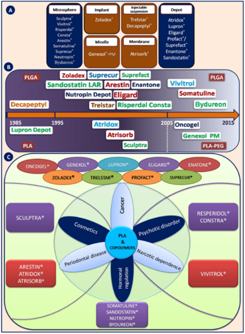 图1: PLA/PLGA的给药系统进展示意
