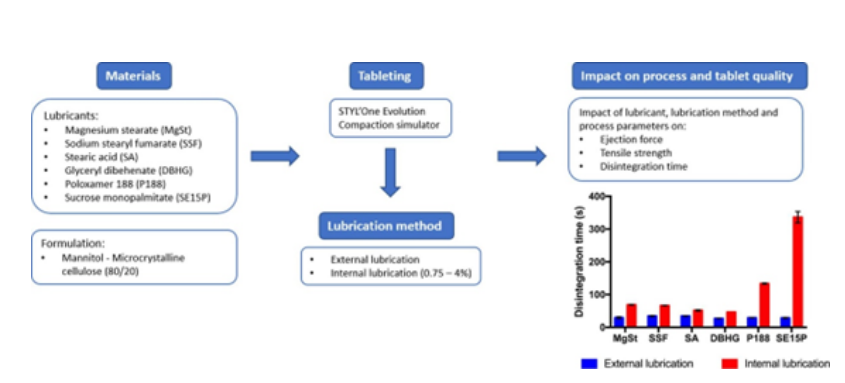 研究了与压片工艺(主压实压力和压片速度)和外部润滑系统(喷洒时间、雾化压力和除尘系统)相关的工艺参数对安慰剂配方(80%甘露醇 – 20%微晶纤维素)响应的影响。且以内部润滑的混合物(0.75 – 4%)作为参比结果对比。事实证明,所有润滑剂都成功地通过外部润滑降低了顶出力,同时与内部润滑相比,润滑剂浓度大大降低。无论润滑剂类型如何,都没有观察到外部润滑对拉伸强度和崩解时间的负面影响。这与内部润滑形成鲜明对比,内部润滑通常观察到抗拉强度降低和崩解时间延长。