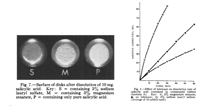 十二烷基硫酸钠也具有优异的片剂润滑性能,因此也可以考虑将其应用于制剂处方开发中,除非存在特定的不相容性或稳定性问题。例如有文献研究使用了疏水性润滑剂硬脂酸镁和水溶性润滑剂十二烷基硫酸钠对水杨酸片剂中溶出速率的影响。