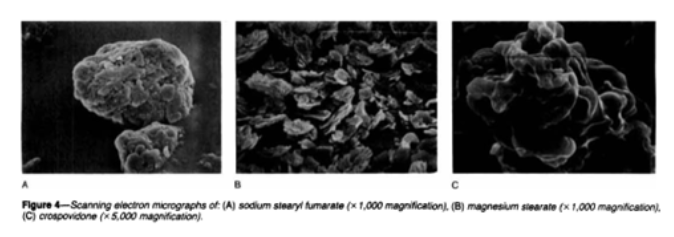 硬质富马酸钠是一种亲水性的润滑剂,它对使用量和混合时间基本不敏感,不同的使用量和混合时间,对片剂的可压性、崩解和溶出基本没有影响,因此,在某些固体制剂的处方中,硬质富马酸钠是硬脂酸镁的一种良好替代品。扫描电子显微图显示了富马酸硬脂酰钠、硬脂酸镁的扫描电子显微图。硬质富马酸钠颗粒是由近球形的小颗粒凝聚而成,形成光滑、不连续、有光泽的表面。