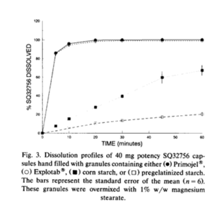 有文献研究结果可知由淀粉衍生而来的高效崩解剂羧甲基淀粉钠可显著提高片的溶出能力,而玉米淀粉和预糊化淀粉缺乏超级崩解剂的膨胀能力,无法破坏颗粒周围的疏水膜因而导致溶出速率较低。且含有预胶化淀粉的颗粒与玉米淀粉相比,溶解性降低幅度更大。这可以解释为预胶化淀粉是比玉米淀粉粘性稍好的粘合剂。