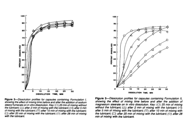 当然,我们并不希望它形成一种连续的润滑膜,因为如果润滑剂的使用剂量过高或者总混时间过长,润滑剂在颗粒表面的覆盖更广,会逐渐形成连续的润滑膜,一方面会导致颗粒间的键合作用力减弱,导致片剂的性能较差;另外,如果颗粒表面覆盖更多的疏水性润滑剂,也会影响水溶性介质更好的进入片芯,从而影响片剂的崩解和溶出。这种影响的大小可能取决于MS的用量、粒径、药物性质、片剂配方组成、各种加工变量以及溶出条件(特别是搅拌强度)的选择。