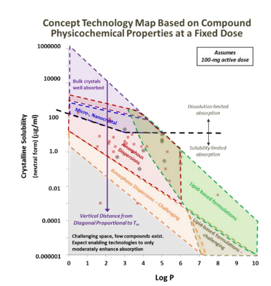 比较现实的问题,有些化合物可能兼具熔点高和LogP大的特点,大概可以推测出此化合物可开发性极差,很难通过增溶的技术达到目标的生物利用度,当然,药物分子在胃肠道吸收的过程和机制极其的复杂,尚需进行全面的研究。从上可知,化合物结构导致药物分子用于口服给药具有挑战性的物理化学特性,从药物溶解度的角度提炼出了化合物两个最基本的理化性质参数熔点和LogP,可用于表征化合物的溶解度限制因素,从而可以有针对性的选择增溶策略。