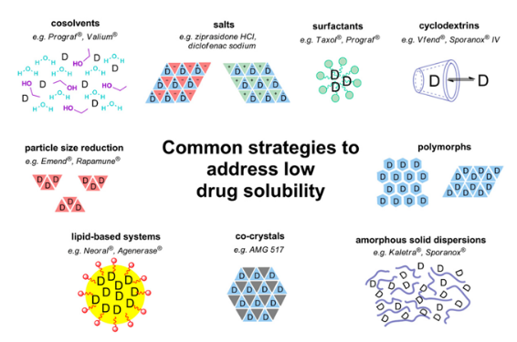 为了解决限制药物吸收的溶解度问题,提高药物的体内暴露,制剂科学家们探究了众多的增溶策略(图2),如原料粉碎,微粉甚至纳米化,环糊精包合技术以及在处方中加入助溶剂,潜溶剂,增溶剂,药物固态开发策略(包括多晶型筛选,盐型/共晶研究,无定形固体分散体制备)以及脂质制剂(如微乳,纳米乳等)。