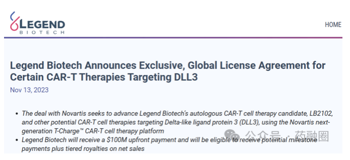 2023年11月,传奇生物与诺华达成了独家全球许可协议,诺华将获得针对靶向δ样配体蛋白(DLL3)候选药物LB2102的CAR-T疗法。预付款为1亿美元,并有资格获得高达10.1亿美元的临床、监管和商业里程碑付款以及分级特许权使用费。