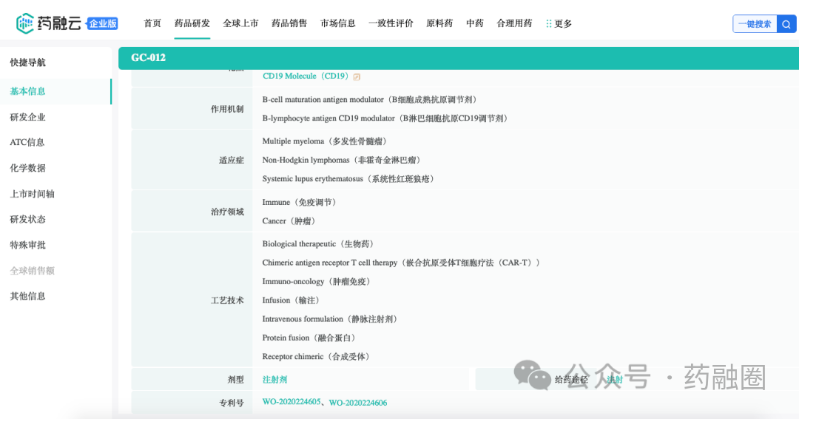 此次拟议收购将为阿斯利康公司不断扩充的细胞疗法管线增添GC012F CAR-T细胞疗法。作为基于FasTCAR技术平台打造的核心产品,GC012F是一款处于临床阶段的创新型BCMA/CD19双靶点自体嵌合抗原受体T(CAR-T)细胞疗法,有望成为针对多发性骨髓瘤、其他各类恶性血液肿瘤以及自身免疫性疾病(包括系统性红斑狼疮(SLE))的新一代治疗方案。药融云数据库监测显示:本品相关专利有WO-2020224605、WO-2020224606等。