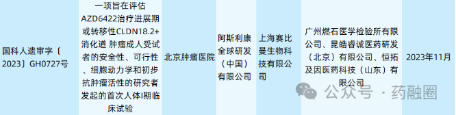 “一项旨在评估AZD6422治疗进展期或转移性CLDN18.2+消化道 肿瘤成人受试者的安全性、可行性、细胞动力学和初步抗肿瘤活性的研究者发起的首次人体I期临床试验”已经在2023年11月通过遗传办审批。
