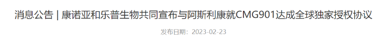 2023年2月23日,康诺亚生物和乐普生物共同宣布,与阿斯利康(AstraZeneca)就CMG901达成全球独家授权协议。阿斯利康将负责CMG901的全球研发、制造和商业化。由康诺亚和乐普生物合资设立的KYM Biosciences将获得6300万美元的预付款以及最多11.25亿美元的潜在额外研发、销售相关的里程碑付款。