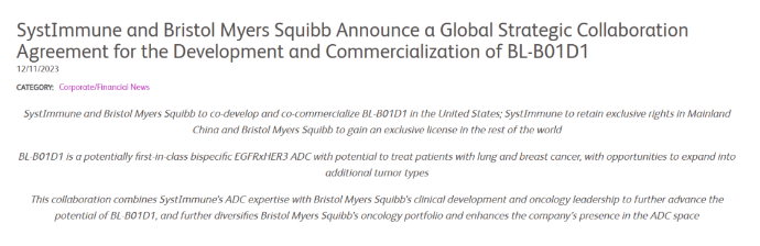 2023年12月11日,BMS引进百利天恒子公司SystImmune EGFR x HER 3双抗ADC药物BL-B01D1。BL-B01D1是百利天恒根据HER3/EGFR双抗SI-B001开发的双抗ADC,目前处于III期研究阶段。