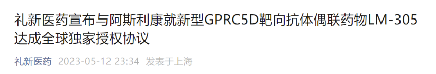 2023年5月12日,礼新医药宣布已与阿斯利康就临床前阶段的GPRC5D靶向ADC LM-305项目达成全球独家授权协议。
