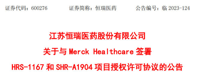 2023年10月30日,恒瑞医药发布关于与Merck Healthcare签署HRS-1167和SHR-A1904项目授权许可协议的公告。将具有自主知识产权的1类新药HRS-1167片和注射用SHR-A1904项目有偿许可给Merck Healthcare。