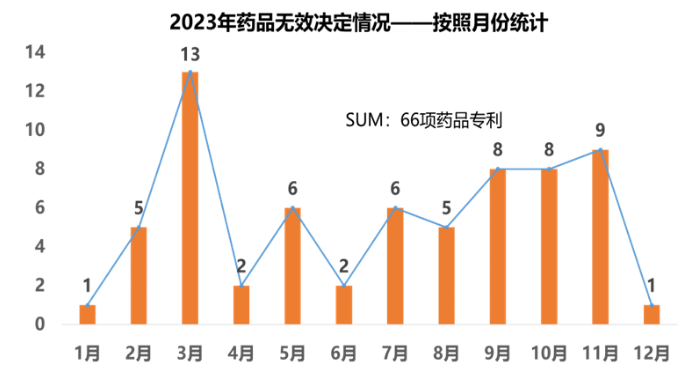 经统计,2023年药品专利案件,复审委做出无效决定共计66项,每个月份的无效决定出具情况不尽相同。其中,3月份达到峰值,复审委做出13项药品无效决定;1月份和12月份均1件无效决定出具。
