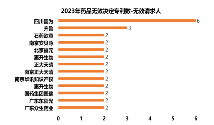 经统计,2023年药品专利案件,涉及2项专利出具无效决定的无效请求人共有13家。
