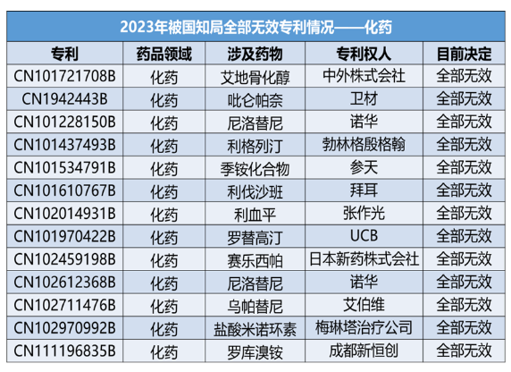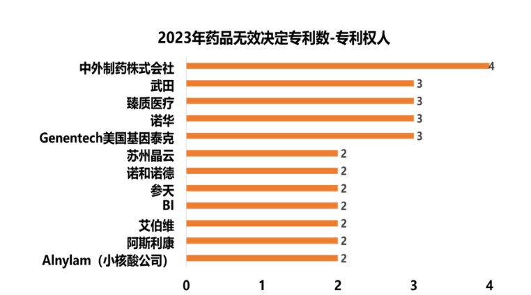 经统计,2023年药品专利案件,涉及相关专利做出2次无效决定以上的,所属专利权人共有12家公司。
