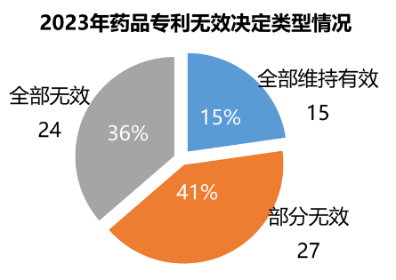 经统计,2023年药品专利无效决定66项中,27项部分无效、24项全部无效及15项全部维持有效。