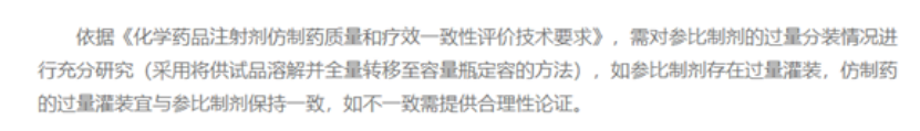过量体积可参照中国药典增加灌装量,如不符合,应进行可转移体积等研究与参比制剂一致,均需确保每支(瓶)产品的实际给药剂量均不低于标示量。