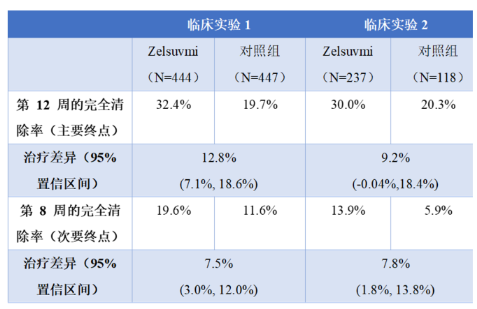 在临床实验3中,Zelsuvmi组和对照组在第12周的完全清除率分别为26%和22%,95%的置信区间为(-5%,14%)。