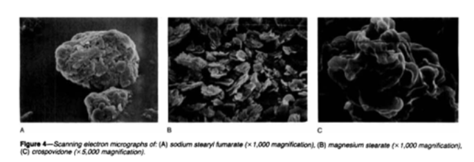 硬质富马酸钠是一种亲水性的润滑剂,它对使用量和混合时间基本不敏感,不同的使用量和混合时间,对片剂的可压性、崩解和溶出基本没有影响,因此,在某些固体制剂的处方中,硬质富马酸钠是硬脂酸镁的一种良好替代品。扫描电子显微图显示了富马酸硬脂酰钠、硬脂酸镁的扫描电子显微图。硬质富马酸钠颗粒是由近球形的小颗粒凝聚而成,形成光滑、不连续、有光泽的表面。