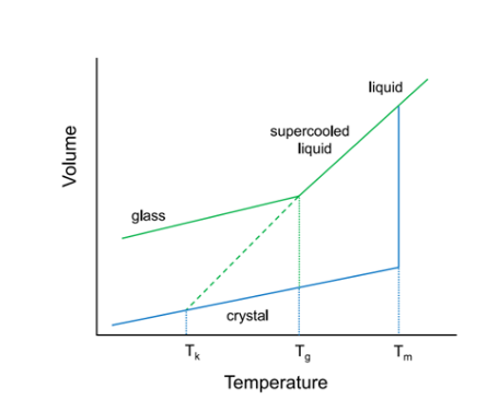 固体形式中除了晶体药物,还有非晶体药物性质,即无定形形式。对于无定形固体药物来说,描述去物态变化的参数不再称为熔点,其具有两种形态,过冷液态和玻璃态,二者之间的界限,称之为玻璃化转变温度(图1)。一般大于玻璃化转变温度,分子动力学运动加剧,引起无定形的不稳定,故而一般认为无定形或者ASD的玻璃化转变温度越大越好,一般标准为75-80℃以上。