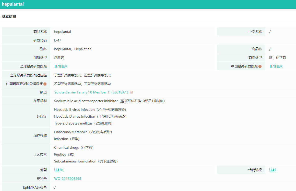 贺普拉肽作为一款有望实现慢性乙肝的程度性治愈的国产治疗药物,其研发进展一直备受关注。贺普拉肽(L47,Hepalatide)是上海贺普药业自主研发的1.1类创新化学药品,是一种来自乙肝病毒(HBV)Pre-S1衍生的47aa合成肽,可通过与肝细胞表面的HBV进入受体牛磺酸胆酸钠共转运多肽(NTCP)竞争性地结合以阻断HBV进入肝细胞。