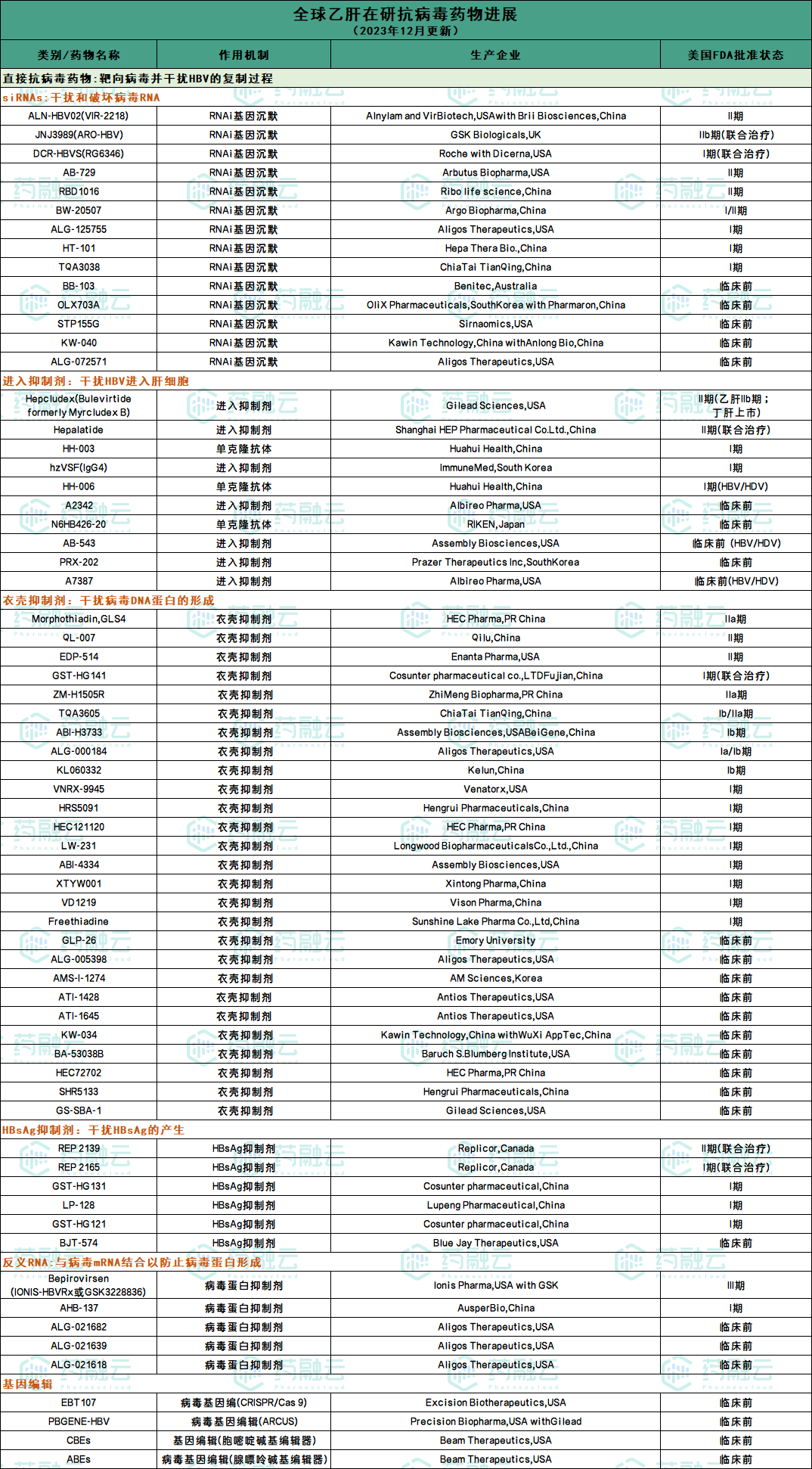 附:全球乙肝在研抗病毒新药进展统计表(2023年12月更新)
