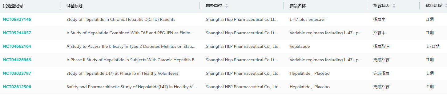 其另一项随机双盲、安慰剂对照、多中心II期研究(NCT05244057)旨在评估三联疗法Hepalatide+聚乙二醇干扰素α +TAF对核苷经治≥ 2年的慢性乙型肝炎患者的有效性,目前正在进行受试者招募。