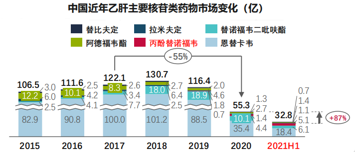 目前,干扰素和核苷(酸)类药物是临床上批准用于治疗慢性乙肝的药物。药融数据显示,核苷类似物药物市场规模从2016年的111.6亿人民币下降至2020年的55.3亿人民币,预计随着诊断率的进一步提升,核苷(酸)类药物市场将从2025年的123.3亿增长到2030年的183.7亿;随着更多创新型乙型肝炎病毒药物陆续上市,市场将开始大幅增长。