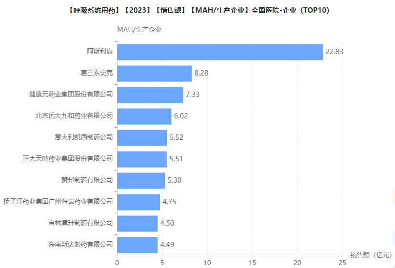 从企业来看,2023年呼吸系统用药市场,阿斯利康以16%的市场份额遥遥领先,其次为GSK、健康元等药企。