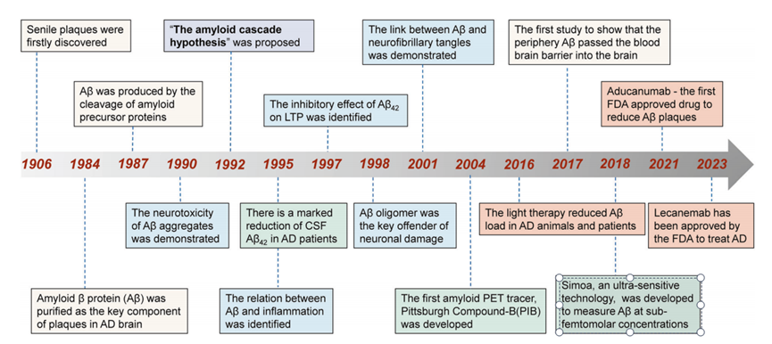 首先,我们来了解下,最被认可的一种作用机制淀粉样蛋白β蛋白学说,这个机制从发现到药物上市,总共经历了相当漫长的过程,从1906年首次发现老年斑块,1984年首次发现Aβ是AD斑块形成的原因,1987年,发现Aβ是由淀粉样前体蛋白裂解产生的,直到2021年首款药物aducanumab被获批,这次的获批还是被附条件获批,存在很大质疑,特别是疗效的质疑,2023年仑卡奈单抗被完全获批,也就是说直到2023年,淀粉样蛋白β蛋白学说才被完全证实有效。从这一机制发现到药物的获批,共经历了接近40年的时间,可见其研究有多么困难。