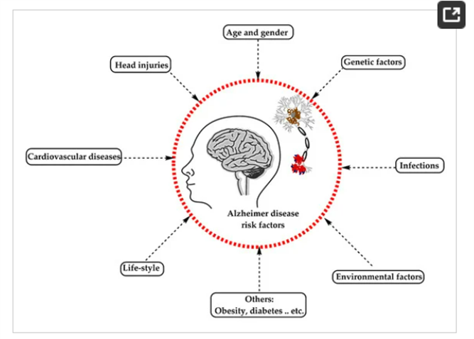 AD 被认为是一种多因素疾病,与多种危险因素相关(图 2),例如年龄增长、遗传因素、头部受伤、血管疾病、感染和环境因素(重金属、微量金属等)。阿尔茨海默病病理变化(Aβ、NFT 和突触丧失)的根本原因仍不清楚。科学家们提出了几种假说,这几种假说认为是 AD 的病因,比如:淀粉样蛋白假说、Tau蛋白学说、胆碱能功能损伤假说、炎症假说、微生物-肠道-大脑轴假说、淋巴回流受损学说等等,其中最被认可的两种原因分别是:胆碱能功能受损学说以及淀粉样蛋白β蛋白学说。然而,目前尚无公认的理论来解释 AD 发病机制。