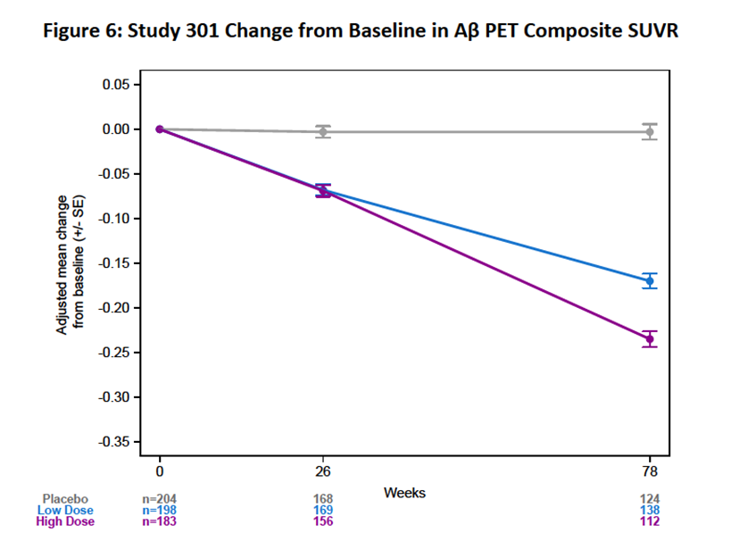 勃健进行了为期18个月的随机、双盲、安慰剂对照、平行组研究(301和302),评估了Aducanumab的有效性、安全性、药代动力学和药效学特性;这两项研究共招募了20个国家248个地区的3285个病人,在这些研究中,纳入了ApoE ε4携带者和ApoE ε4非携带者,该研究的主要目的是评估Aducanumab在减少CDR-SB患者认知能力下降方面的疗效,结果显示:从图3和图4可以看出,301(ApoE ε4携带者)和302(ApoE ε4非携带者)两个研究组在高剂量和低剂量组均能够显著降低Aβ淀粉样蛋白,然而在改善患者认知的临床效果上显示(见下图5),302具有明显的效果,而301却未显示出临床效果,据研究报道,阿尔茨海默病大部分都是ApoE ε4携带者,此外,研究301中高剂量组对CDR - SB的影响幅度从无效分析(15%)到最终分析(2%)变化最大,表明301对CDR - SB的不稳定,这很大程度上对Aducanumab的效果存在质疑。但由于阿尔茨海默病的临床需求,FDA还是附条件批准,希望批准后,能够获得更大的数据来解释这一结论。